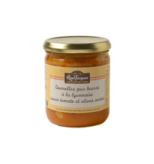 Ingrédients: quenelle pur beurre 41% [OEUFS, farine de BLE (GLUTEN), BEURRE doux 20% (LAIT), eau, sel, lactoserum doux, arôme naturel et dextrose], vin blanc (SULFITES), eau, crème (lait), concentré de tomates 11%, olives vertes 5%, jus de veau [fécule de pomme de terre, arômes, sel, maltodextrine de pomme de terre, plantes aromatiques, tomate déshydratée, farine de BLE (GLUTEN), graisse de poulet, sucre, viande de veau déshydratée, extrait de malt], amidon de pomme de terre, sel, herbe de Provence (Romarin, sarriette, origan, thym), poivre